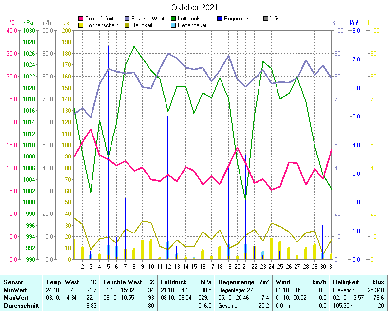 9. Oktober | 10,1 °C | 3,7 °C 04:20 | 21,5 °C 16:35 | 1025,2 hPa | 16:35 | 09:05 | - - | 00:00 | --- | 75 % | 16:15 | 10:55 | 33,7 klux | 13:40 | ||||||||||||||